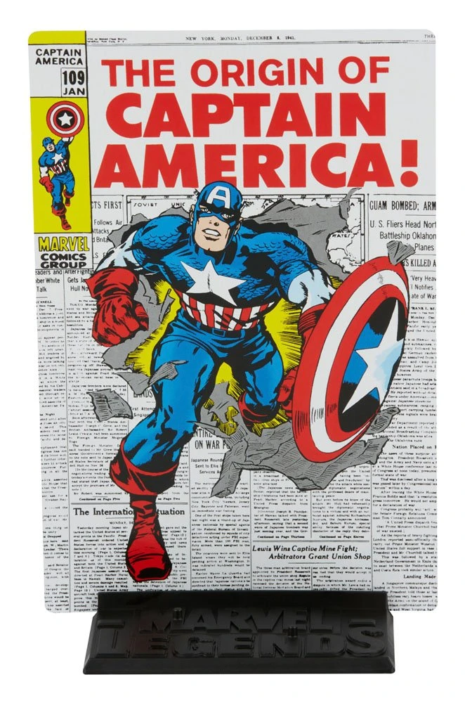 La figura del Capitán América de la Serie 1 viene con nada menos que 14 accesorios y un fondo reversible inspirado en los cómics, para que la exhibas.