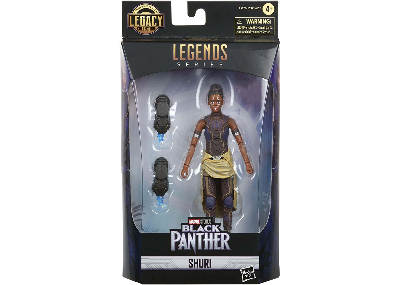 Hasbro presenta dentro de la colección Marvel Legends la figura de Shuri. Shuri, el cerebro detrás de algunas de las tecnologías más avanzadas en Wakanda, diseña y distribuye equipos de vibranio a los principales guerreros y aliados de Wakanda.La figura mide 15 cm e incluye 2 accesorios.