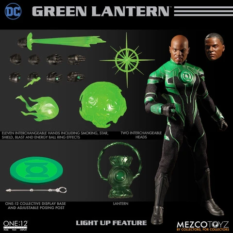 Equipado con una amplia gama de efectos, partes intercambiables y funciones de iluminación (la batería / linterna se enciende), la linterna verde John Stewart mide 17 cm y tiene más de 30 puntos de pivote.