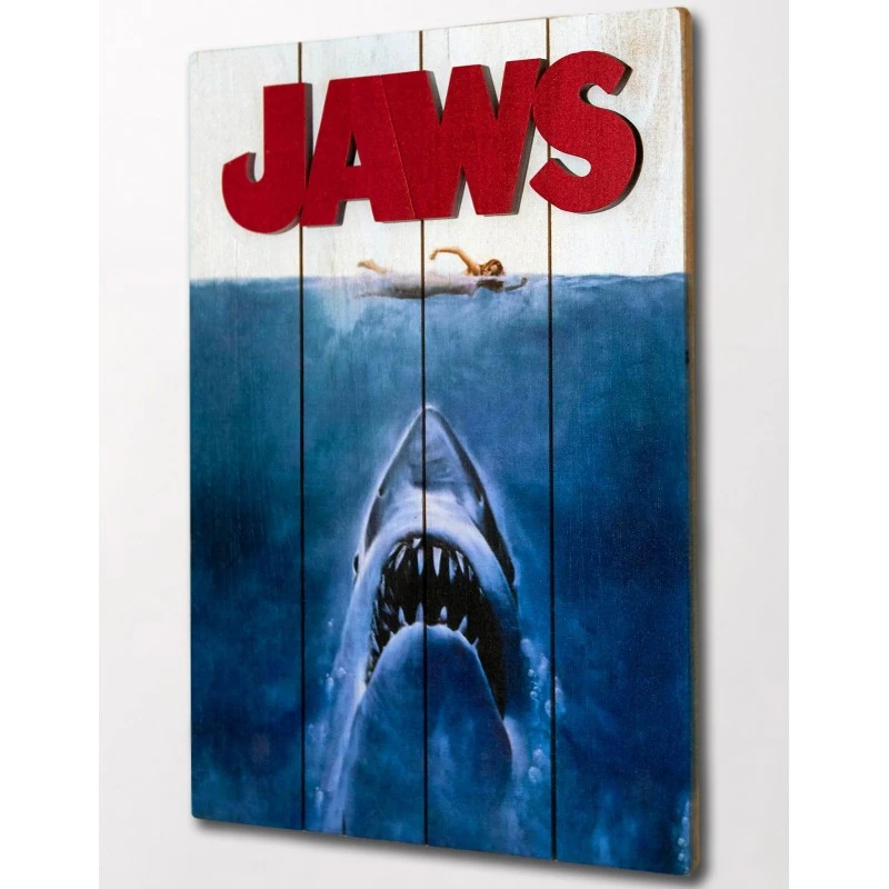 Este producto se basa en una imagen de la icónica imagen del póster de la película Tiburón (1975), mide 30 x 40 cm y viene listo para ser colgado mediante un cordel.