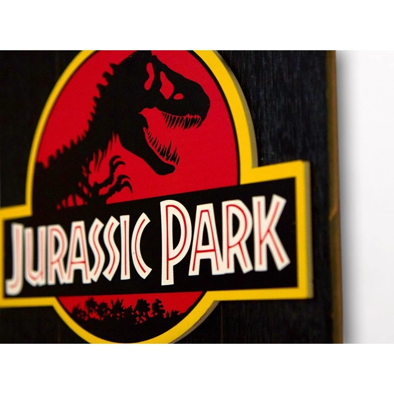 Este producto se basa en una imagen de la icónica portada de Jurassic Park (1993), mide 30 x 40 cm y viene listo para ser colgado mediante un cordel.
