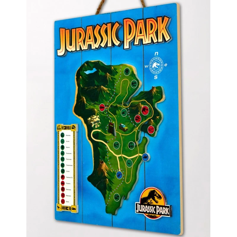 Este producto se basa en una imagen de la Isla Nublar, de la película Jurassic Park, mide 30 x 40 cm y viene listo para ser colgado mediante un cordel.