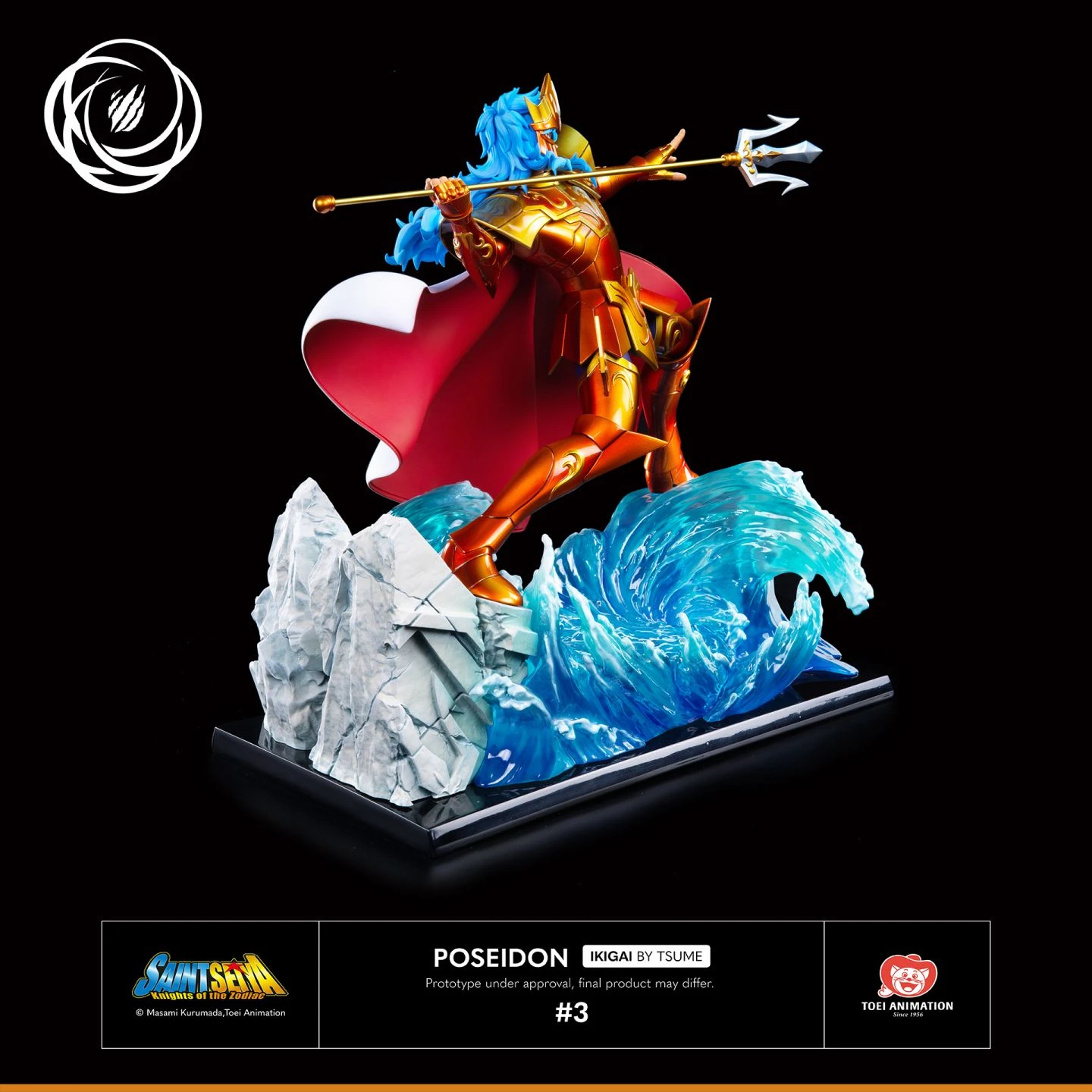 Esta estatua de Ikigai muestra a Julian Solo, el anfitrión de Poseidón, atacando en el arco de Poseidón. Su mirada, tan profunda como el azul del océano, brilla con furia mientras lanza su tridente sagrado a Saori, la reencarnación de Atenea.